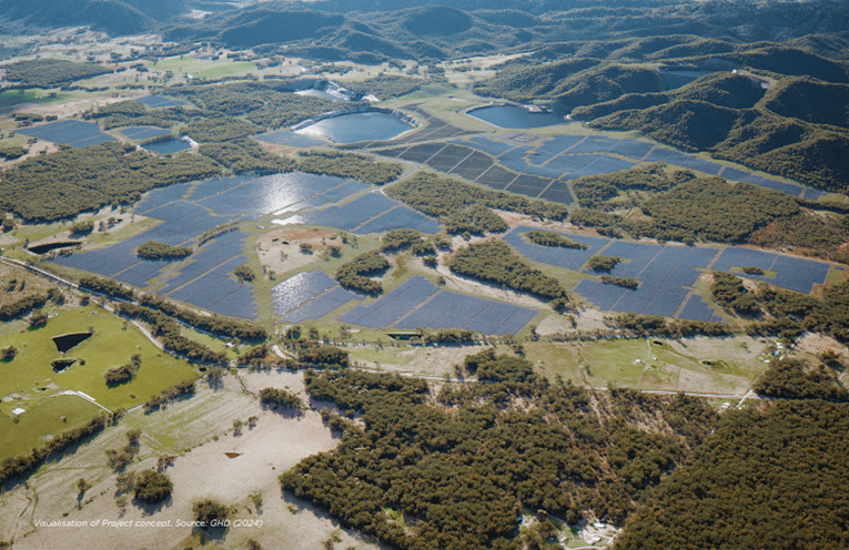 A solar farm would also be constructed to supply approximately 320 MW AC of renewable energy to ‘charge’ the PHES by pumping water from the lower reservoir to the upper reservoir.