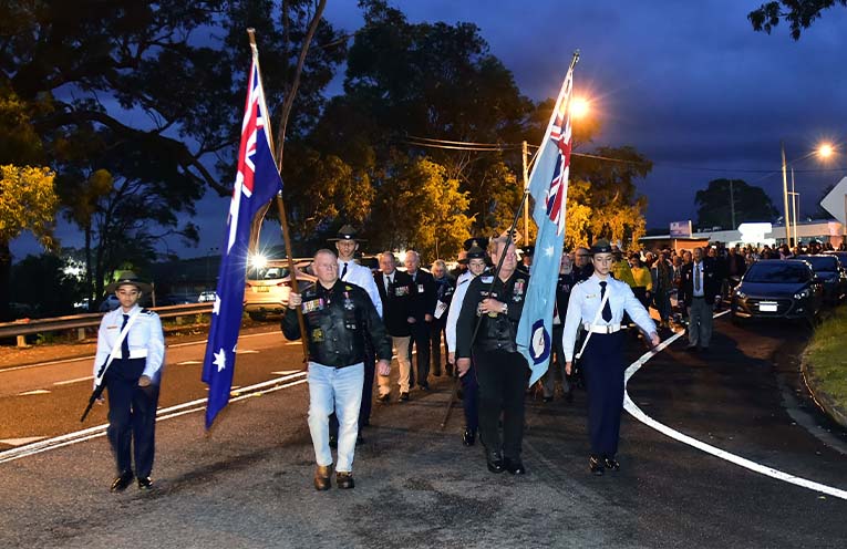 They were supported by flag bearers from the Military Brotherhood and Air Force cadets from 335 Squadron Williamtown.