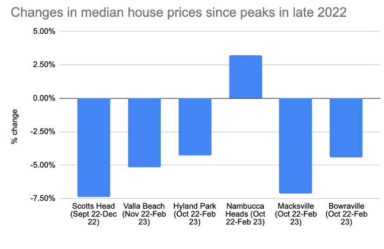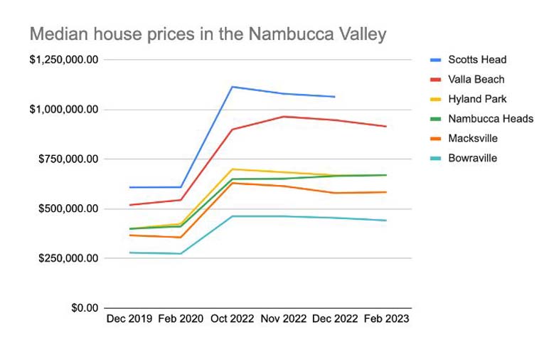 Median house prices, which peaked between September and November 2022 in most parts of the valley, increased 3.23 percent in Nambucca Heads in the four months from October last year to February 2023, pushing prices from $650,000 to $671,000, according to figures from realestate.com.au.