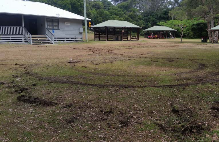 It can be deduced that at some late hour during the night of 29 December a vehicle was driven onto the grassy area in the direct vicinity of the community Recreational Hut, bordered by parking and BBQ shelters, and executed what is colloquially known as ‘circle work’ or ‘burn-outs’, resulting in approximately five circular furrows which ripped up the lawn area.