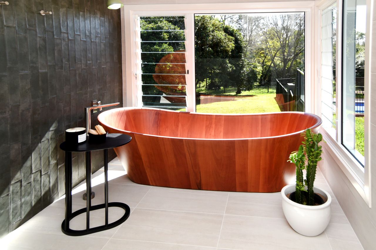 The bathroom also features an amazing rainfall shower with bench seat, a stunning red cedar vanity with stone bench top, designer lighting, heated towel rails and red cedar cabinetry.