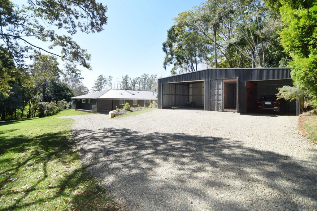A massive three car, freestanding garage in a charcoal colorbond hue, sits comfortably in the surrounding green space towards the front of the block, with an adjoining shipping container that’s been incorporated under the same roof line.