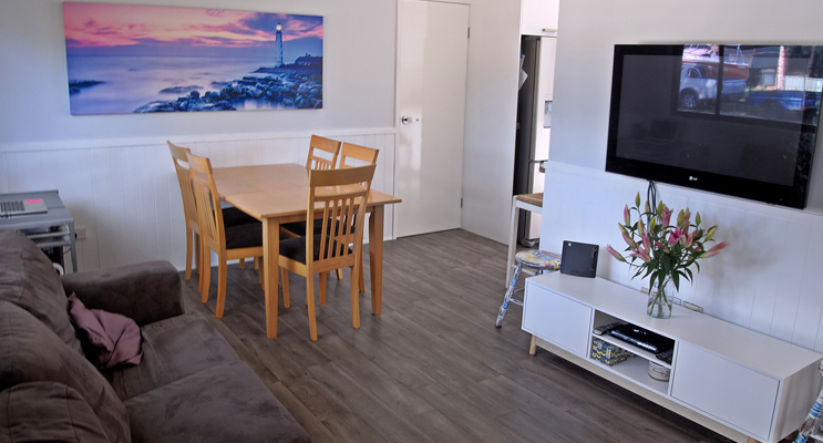 The combined living and dining space features ash grey wood-look floorboards, and connects through to the generous renovated kitchen with loads of bench space, storage, huge pantry, soft close drawers, timber benchtops, stainless steel LG Dishwasher, plus Platinum oven and stove.