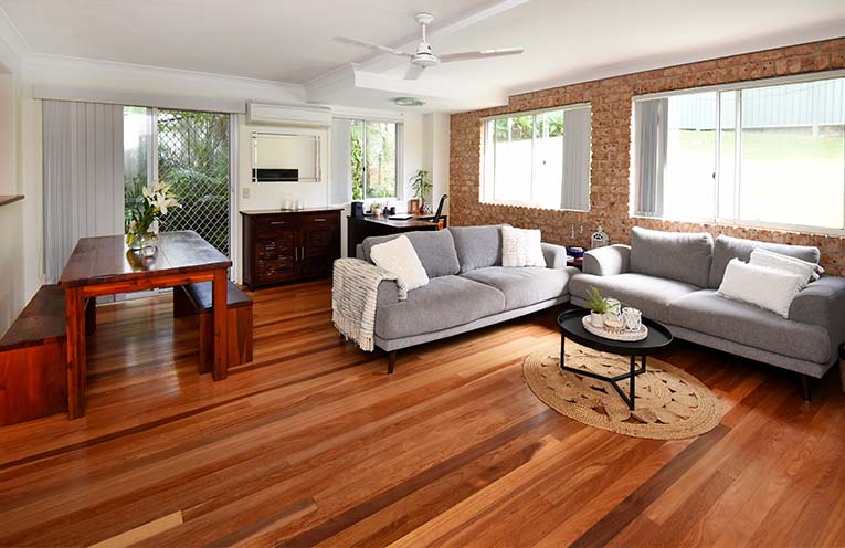 Rich mixed hardwood timber floors define this space, leading to a large screened outdoor room ideal for alfresco entertainment regardless of the weather.