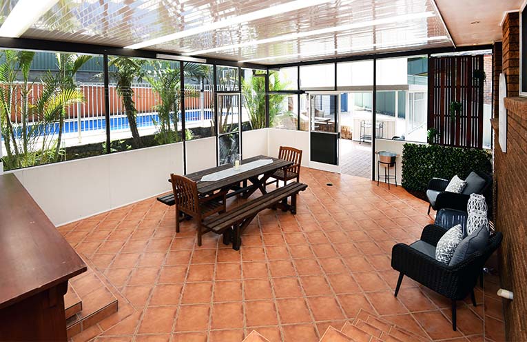 A covered barbecue area with woodfire completes the outdoor entertaining space, perfect for hosting gatherings for friends and family.