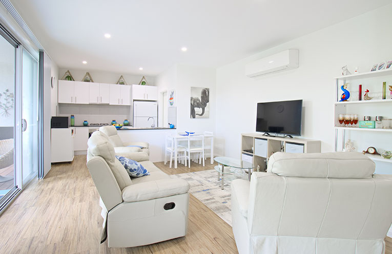 The large open plan living space spills out onto the north facing outdoor deck that enjoys all day sun.