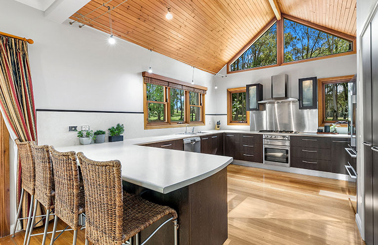 The gourmet kitchen is spacious in size, has plenty of cupboard space, stone-like laminated benchtops, 900mm gas cooktop and electric oven as well as a dishwasher, built in microwave, walk in pantry, breakfast bench and maximises on that natural light coming in from the large surrounding windows.