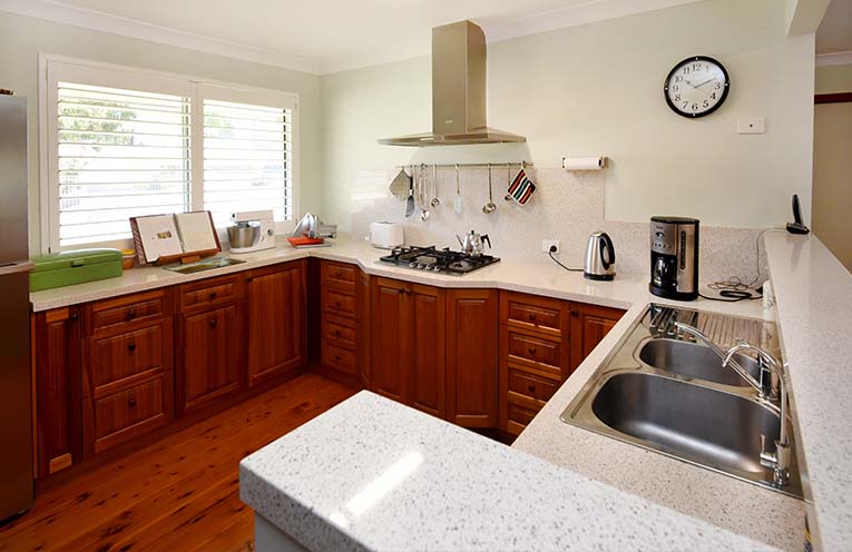 As you enter, you are greeted by a modern, expansive timber kitchen adorned with stunning stone benches.