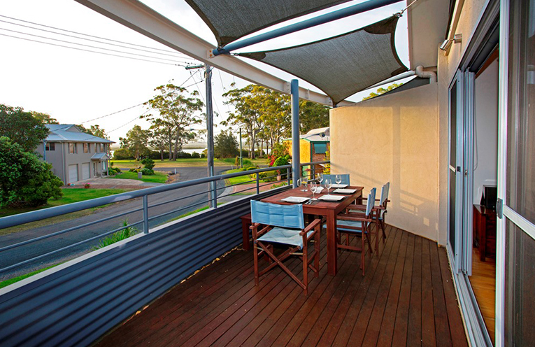 This property was designed with privacy and a relaxed lifestyle in mind. Upstairs, this superb townhouse features air-conditioned open plan living areas with high truss ceilings, skylights and polished timber floors that open onto the front and rear decks.