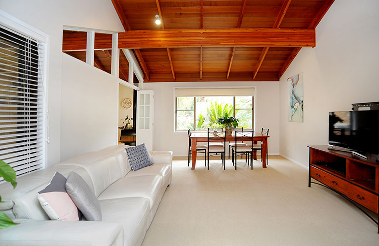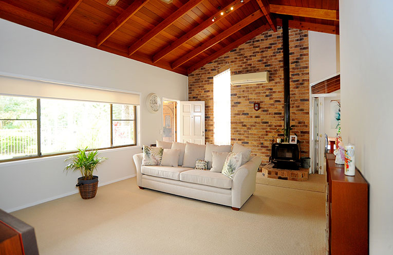 The main living area features pitched timber ceilings and has views directly over the pool area. This room also has reverse cycle air conditioning as well as the charm of a slow combustion wood heater.