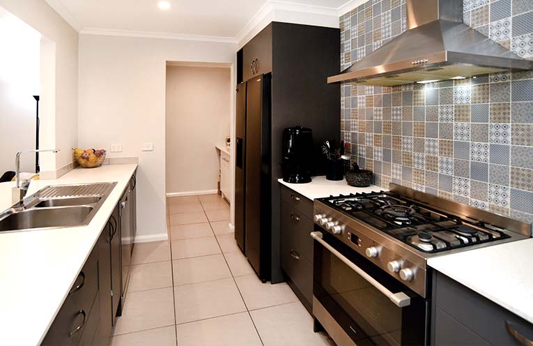 Upon stepping inside, a generously proportioned media room and a double lock-up garage greet you, followed by a corridor leading to the dining area and a chef’s dream kitchen featuring a 900mm oven, gas cooktop, ample bench space, a butler’s pantry, and an elegantly tiled splashback.