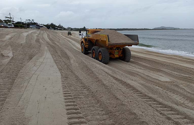 Trucks shifted sand from the Winda Woppa stockpile to Jimmys Beach over the week-long nourishment campaign.