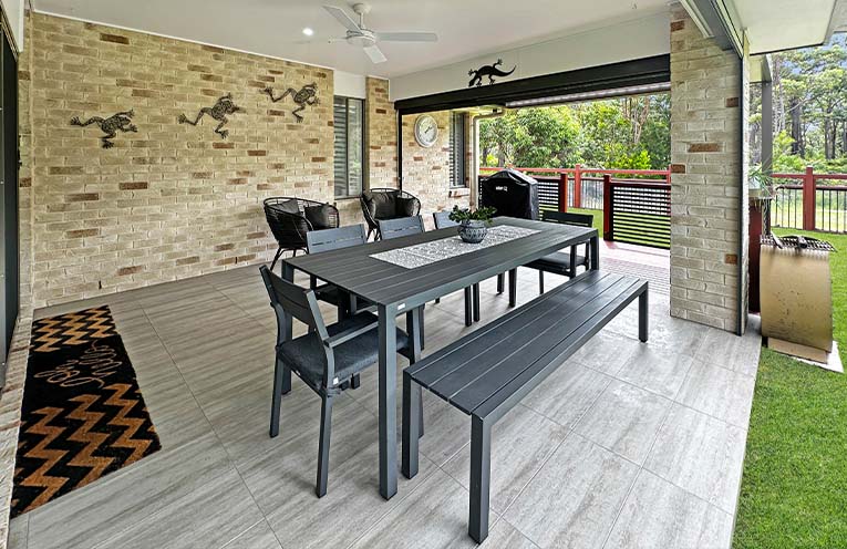 The open-plan living area seamlessly flows to the alfresco entertaining space, complete with zip track blinds, an extended deck, and an Eclipse rain-sensing roof.