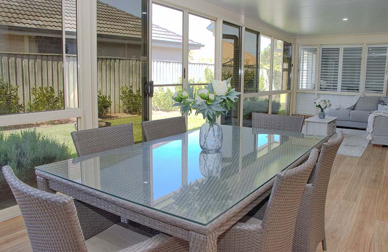 Thoughtfully configured to connect the indoors with the outdoors, the huge screened in paradise room, approximately 11 x 3 m, offers tinted windows for additional privacy and insulation.