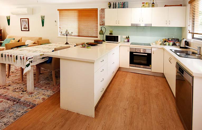 The laundry is conveniently tucked away in this space as well, and is accessed via the concertina white sliding door.