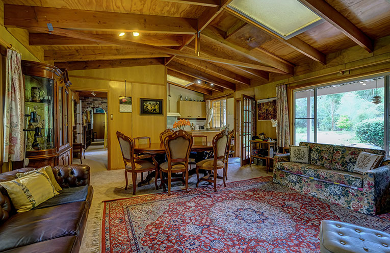 Versatile living/dining space with exposed timber beams and timber-lined feature walls provided a warm and welcoming ambience.