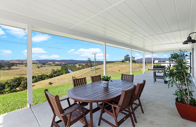 Beyond, the dining and entertainment areas open to a 4m wide, 20m long covered alfresco patio with beautiful property, river, and distant views.
