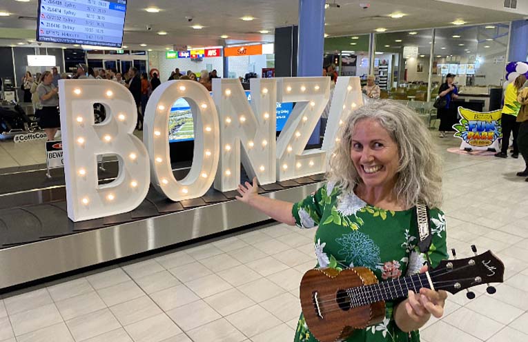 Bells-and-whistles-style celebrations at the airport saw the Uko Ono Sawtell Ukulele Group welcoming the first arrivals from the Sunshine Coast airport, led by Stephanie Sims, the airline’s Bonza Local Legend for Coffs Harbour.