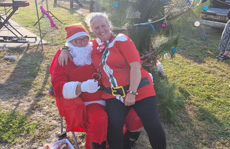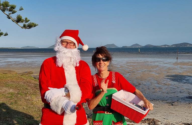Lesley Lane stepped in as Santa’s special helper, assisting as he toured the beachfront and gave out early Christmas presents to the kids – and some adults.