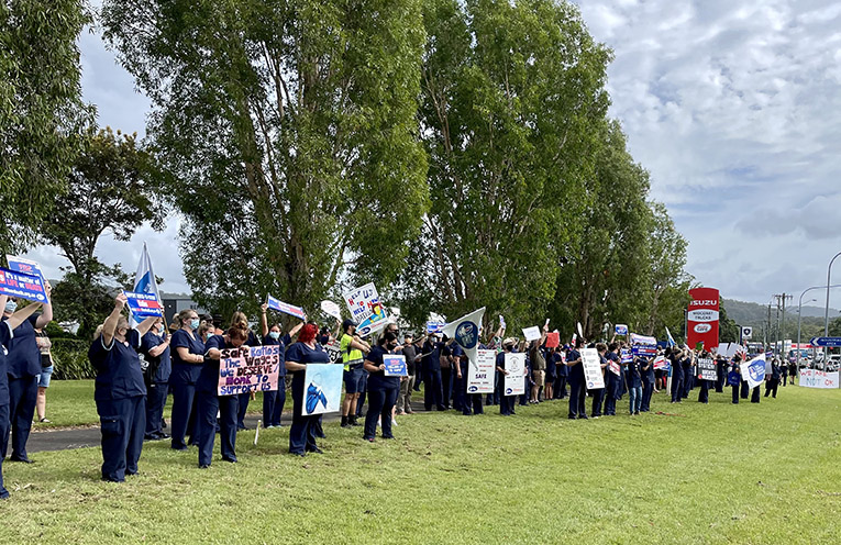 Nurses lined the highway across from the Coffs Harbour Health Campus, holding numerous placards.