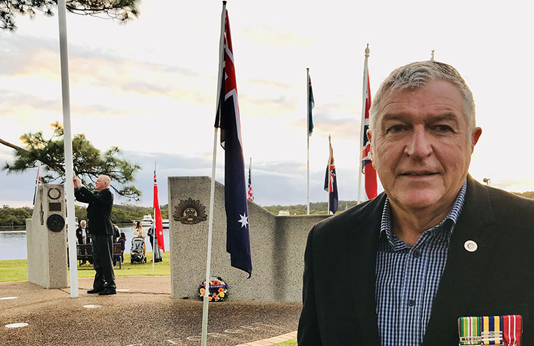 BRUCE Murray, the President of the Hawks Nest Tea Gardens Progress Association, marched for the first time this ANZAC Day with the Tea Gardens Returned and Services League (RSL) of Australia sub-Branch.