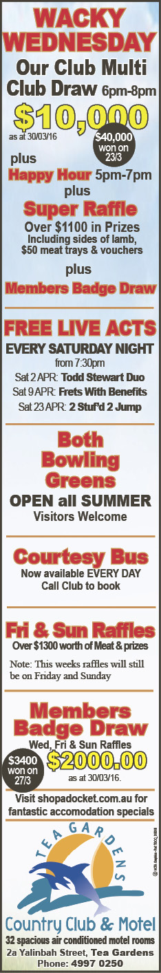 Our closest is at Bulahdelah Bowling Club at 3pm on 5 April. Hopefully we can pack the venue.