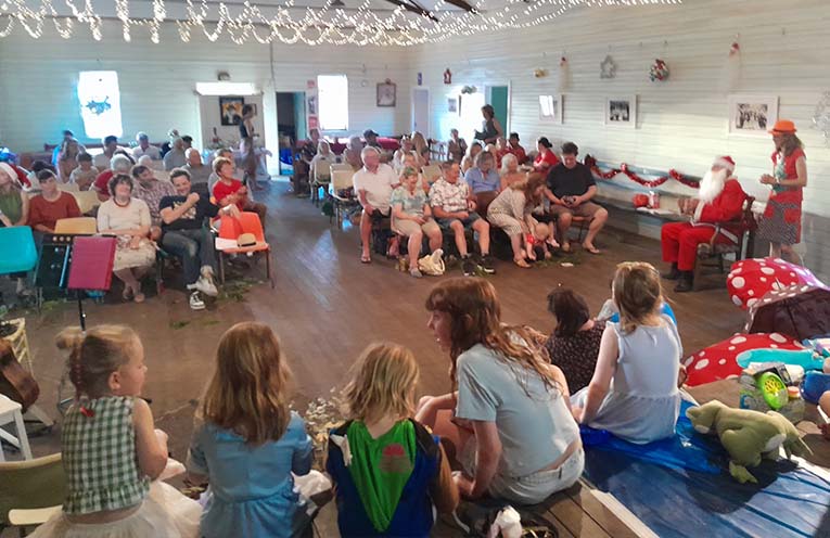 Locals packed the Bandon Grove School of Arts Hall on the evening of 20 December to enjoy sausage sandwiches and salad, socialise, watch the play, and to sing carols. And of course, greet the very special visitor, Santa.