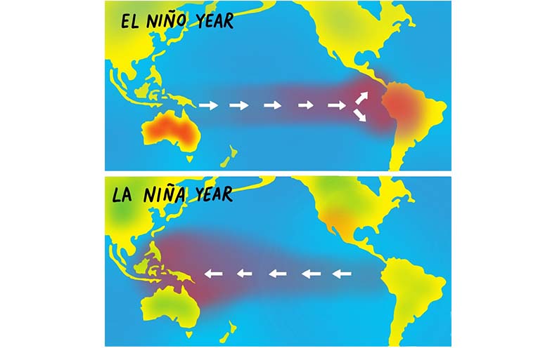 Simply put, El Nino – a cyclical weather pattern in an area between Australia and South America – creates a periodic reversal of winds affecting sea temperatures, heavily influencing rainfall on either side of the South Pacific Ocean.