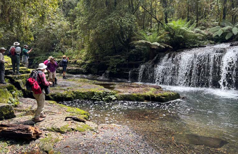 A rest and morning tea at the river waterfall gave walkers a chance to take photos before they headed off again.