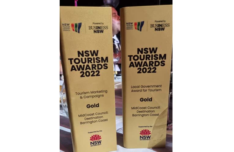 MIDCOAST Council’s tourism brand Barrington Coast has won two gold awards at the prestigious 2022 NSW Tourism Awards in Sydney, with local tourism businesses also among winners and finalists.