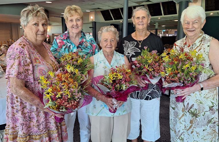 Our Golden Girls, lady vets who have reached their 80’s and 90’s throughout the year, were also celebrated with beautiful flowers from Sharon Barwick and Sue Forde. Pam Kelly, who at 91 is one of the original lady vets golfers, had the honour of cutting the Christmas cake made by Di Smith. We also farewelled Sandra Hargraves, who is leaving us for Brisbane after spending 20 happy years of golfing and friendship in Hawks Nest. She hoped we would all enjoy the same experience here, quipping that “You only realise how good it’s been when you’re gone, and that’s not under!” That’s the spirit!