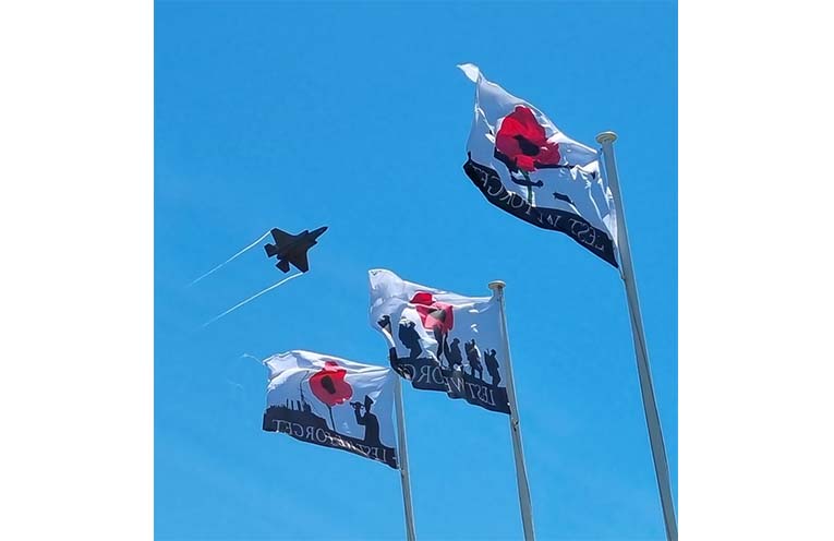 Following the two-minutes’ silence at 11am, the crowd was wowed by the modern fighter jet roaring down the river and screaming across the sky, dipping its wings in skyward salute.