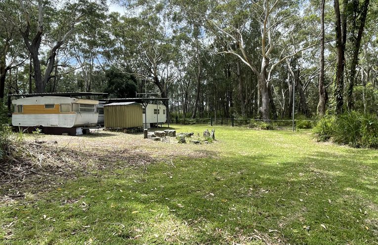 The lots are secluded but easy to access, the power is connected, and there are water tanks, two caravans, a built-in lounge area and a storage shed.
