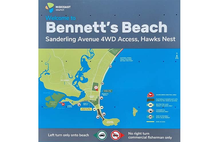 ‘General Access’ permit-holders may only turn left to enter Bennetts Beach from the Sanderling Avenue access, and require a National Parks (NP) permit once parallel with the Myall Lakes NP demarcation.