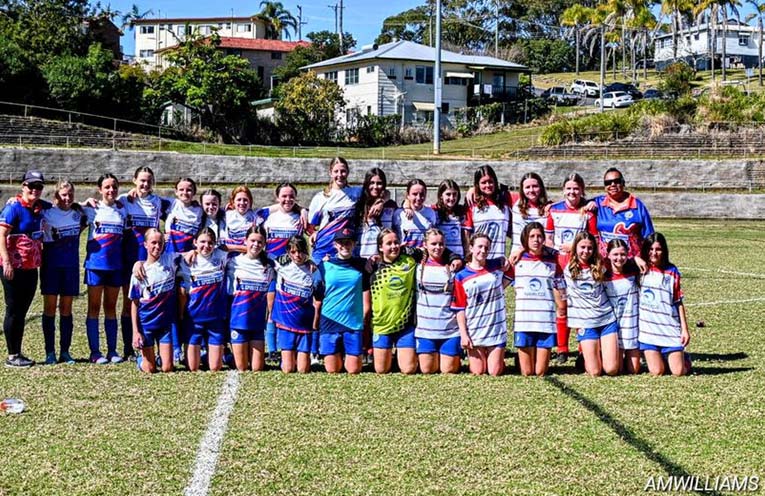 The unity of the Red and Blue Nambucca Strikers under 14s teams on the centre of the pitch signals a promising future for female football in Nambucca.