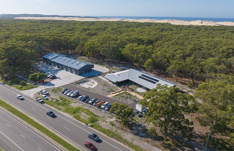 The NPWS office and depot was purpose-built on Worimi Conservation Lands, consolidating office and field-based operations that were formerly separate, while servicing future park management needs and reducing response time for incidents such as bushfires.