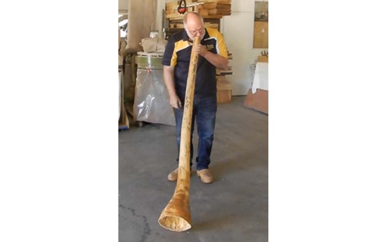 Rob Day from New England Woodturning at Inverell playing a three metre didgeridoo.