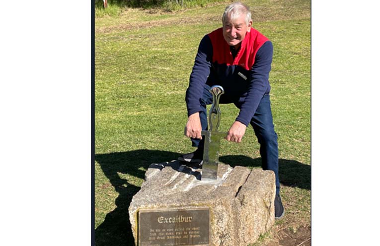 Port Stephens Friendship Group President Keith Hobbs with the Excalibur sword at Glen Innes.