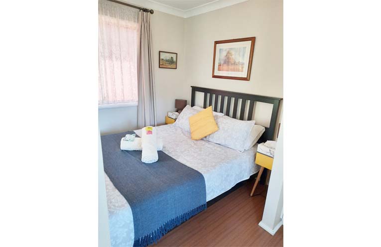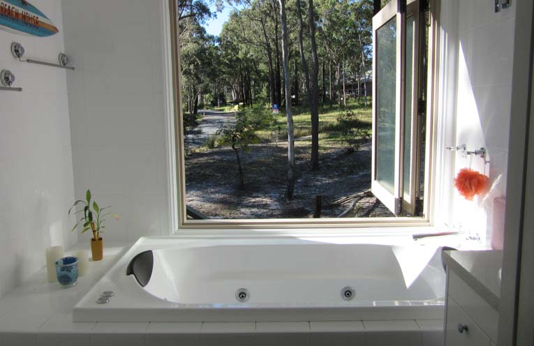 The other side is the self contained space – a one bedroom, with kitchenette, a living and dining area with a full bathroom including a spa bath with stackable window from which to enjoy the view.