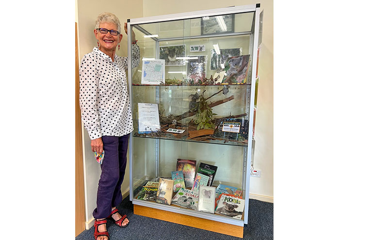 The display case has three levels of content, with a small bush diorama and information about koalas and other wildlife, as well as leaflets explaining the work of the Myall Koala and Environment Group (MKEG).