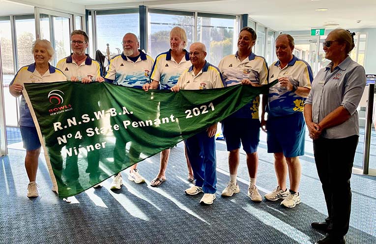 Bowls NSW Chair Dilys Kindleysides visited the club to present the state pennant flags won at this year’s Bowls NSW Open Gender State Pennant Finals in Forster.