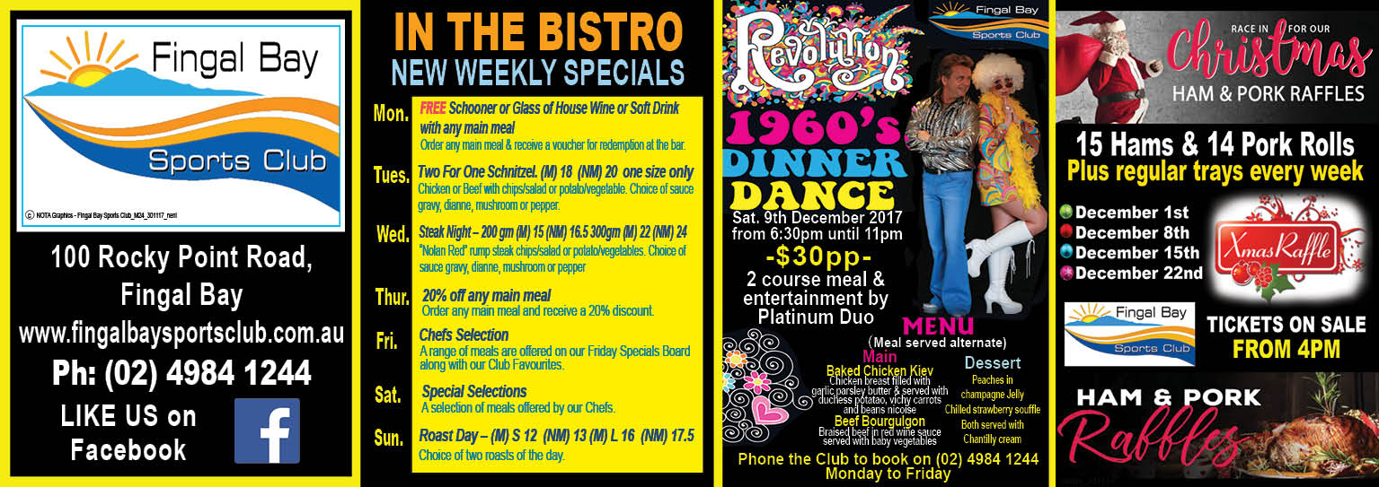 Fingal Bay Sports ClubModern Media: Advertise with News Of The Area and you get your ad in 1) in Print, 2) on the News Website (like this ad), and 3) on our Social Media news site. A much more efficient way to advertise. Reach a HUGE audience for a LOW price TODAY! Call us on 02 4983 2134. Or media@newsofthearea.com.au