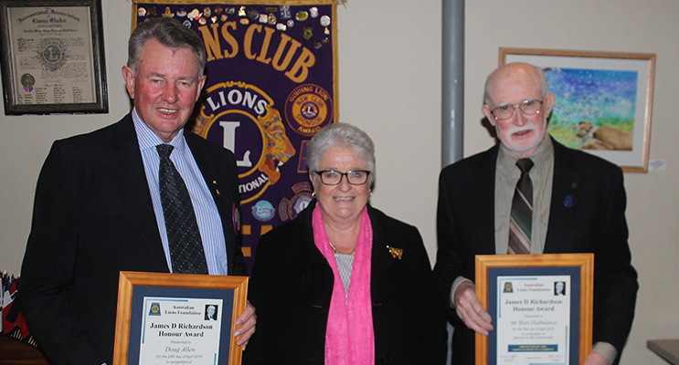 Past District Governor Kate Milford OAM presented two James D Richardson awards to Bart Huthnance and Doug Allen in recognition of their service to the Lions organisation over the last 25 years.