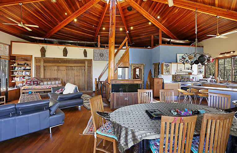 The house itself is a handmade Octagonal pole home including a myriad of unique décor pieces, including carvings of the Hindu Ramayana story.