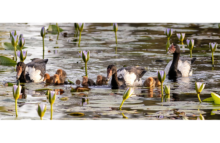 Ian and Ulrieke Kethel of Bellinger Keys report that the Magpie Geese on the small lake near their home have successfully hatched a brood of seven fluffy brown goslings.